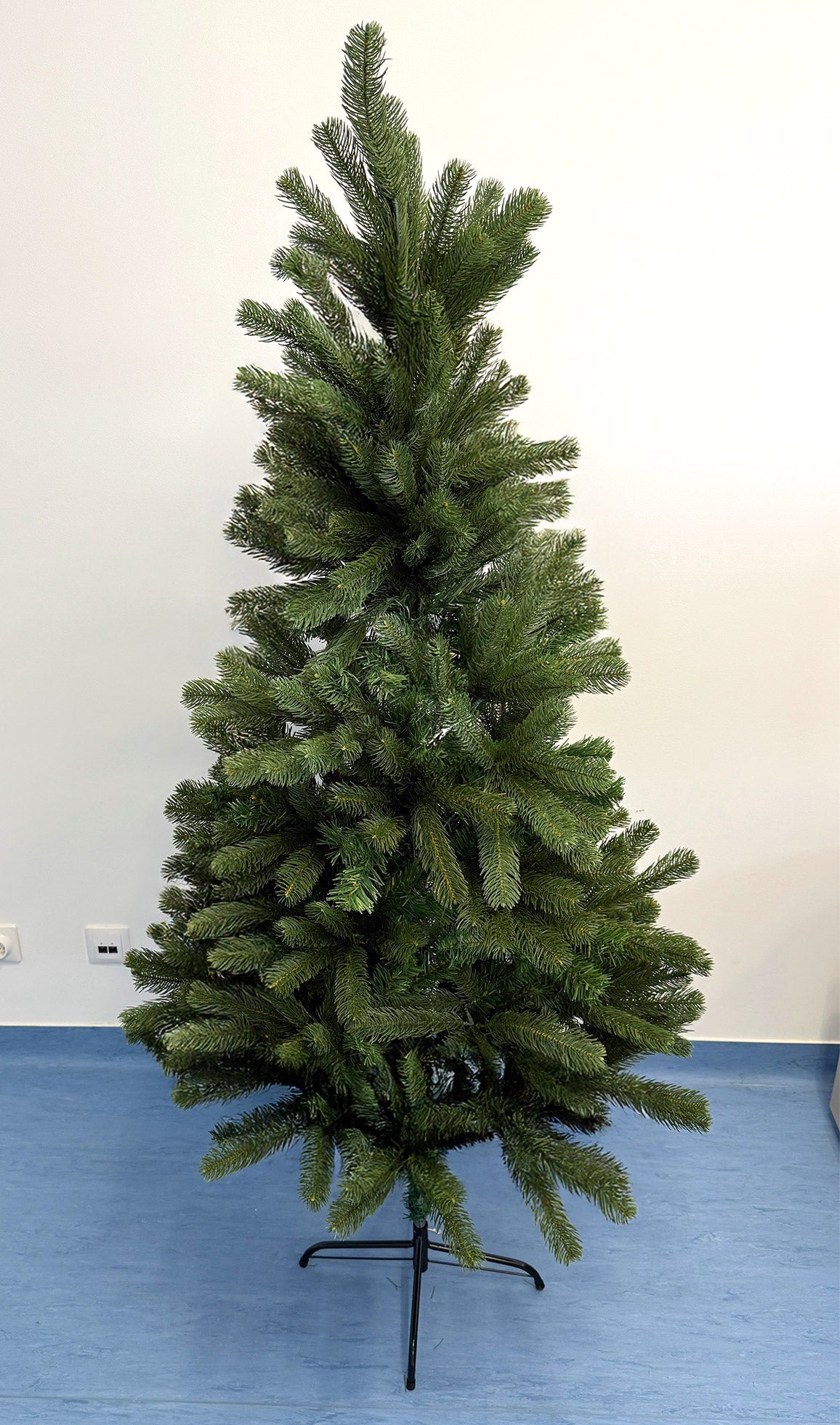 Bradul este realizat dintr-un mix de ramuri PE și PVC. Ramurile din PE imită perfect acele naturale. PVC-ul adaugă densitate și volum. Împreună, creează o coroană bogată și armonioasă. Textura este realistă și plăcută la atingere. Fiecare detaliu este gândit pentru autenticitate. Bradul rămâne frumos și după ani de utilizare.